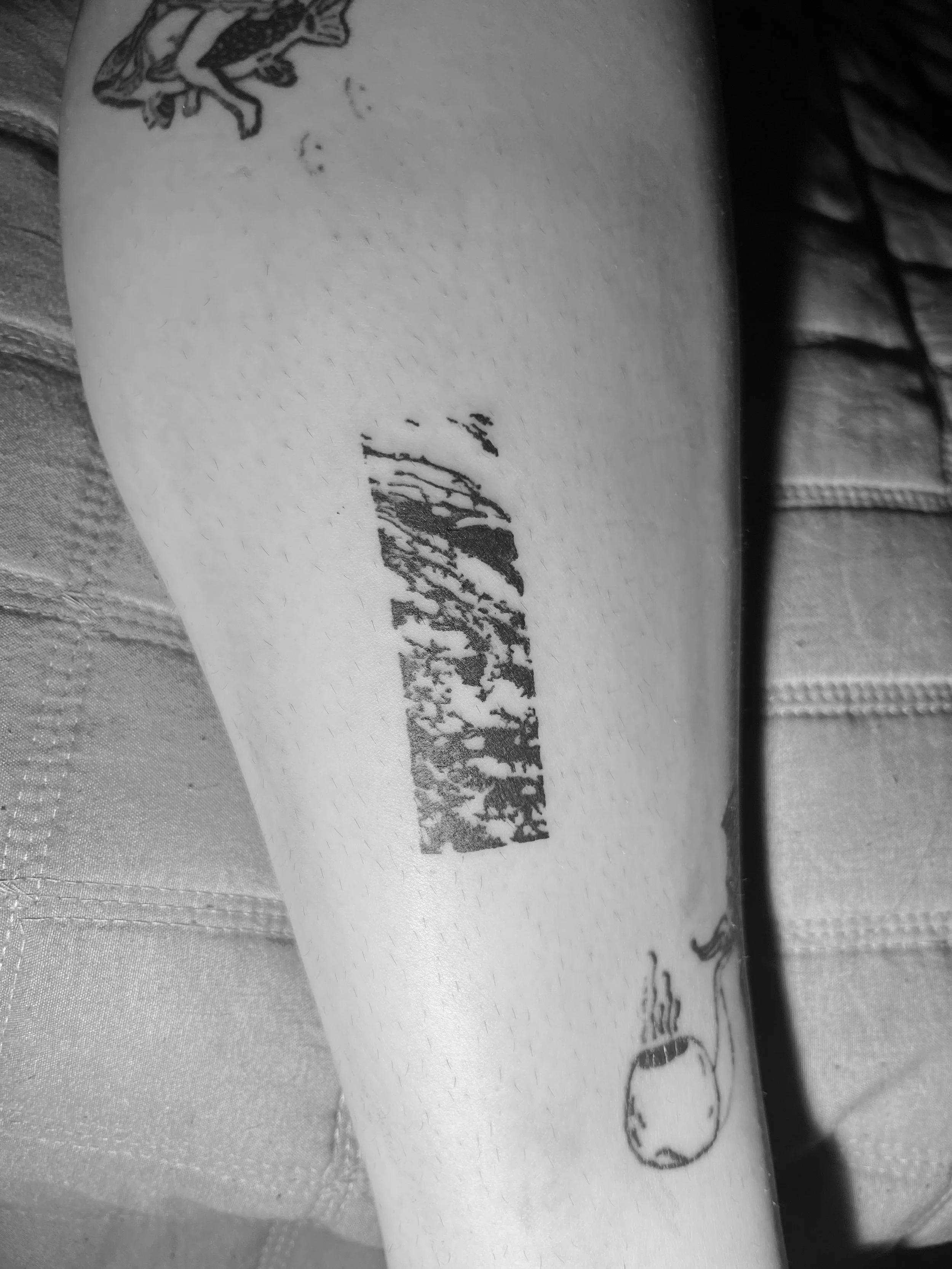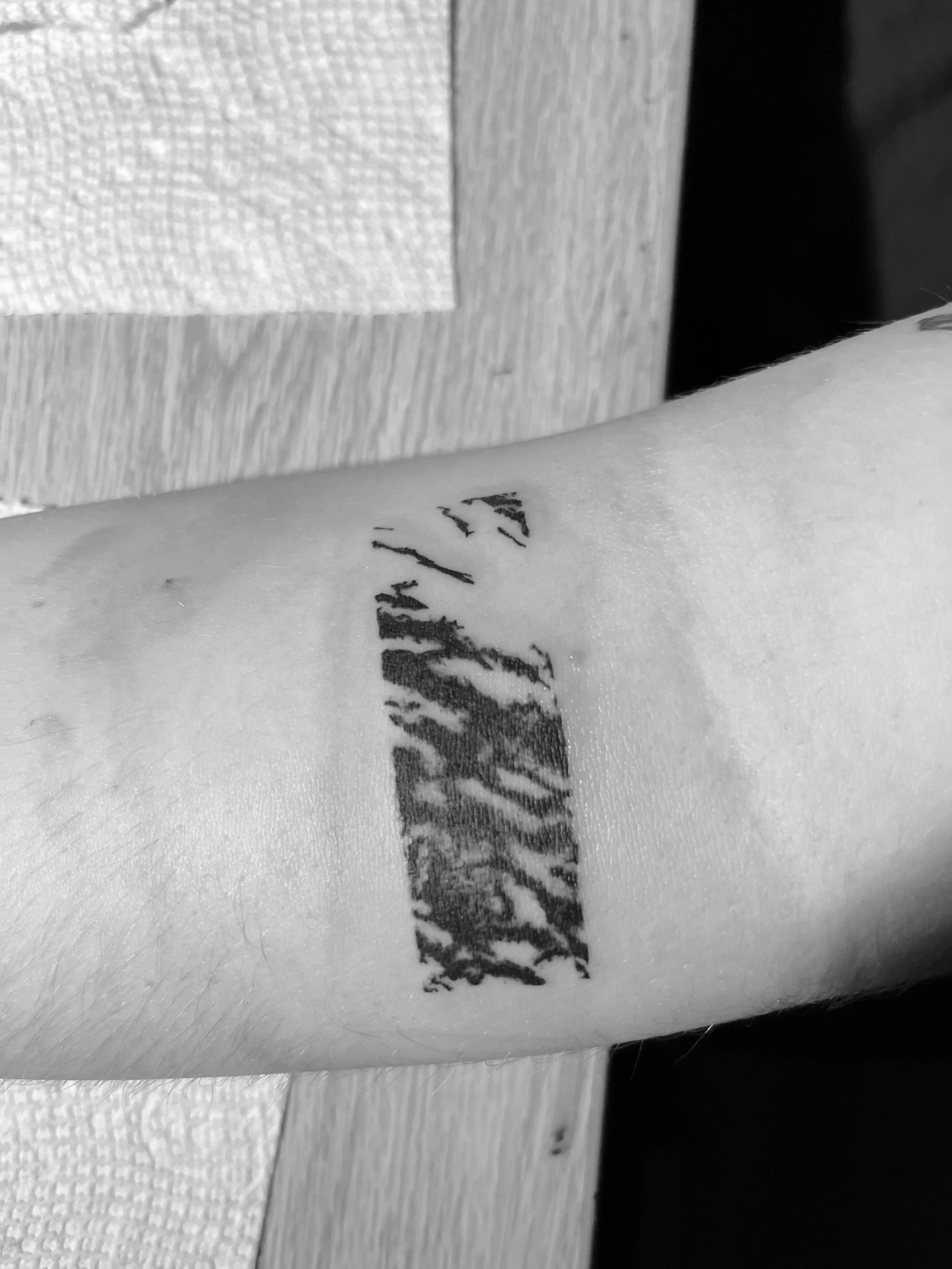 I designed a landscape which I then broke into sections, like a scientist — however, each one is completely abstract and evades discriminate thinking. Each abstract piece is offered as a tattoo, and for around an hour or two, I am up close and intimate with a complete stranger. Each person becomes a part of a collaboration which, together, makes up a whole—a mountain landscape.
